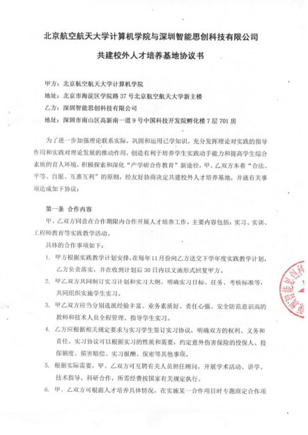 9月13日,智能思創(chuàng)與北京航空航天大學(xué)簽訂了共建校外人才基地協(xié)議。雙方同意在合作期限內(nèi)合作開展人才培養(yǎng)工作,主要內(nèi)容包括∶實習(xí)、實訓(xùn)、工程師教育等實踐教學(xué)活動,積極探索和深化“產(chǎn)學(xué)研合作教育”新途徑。